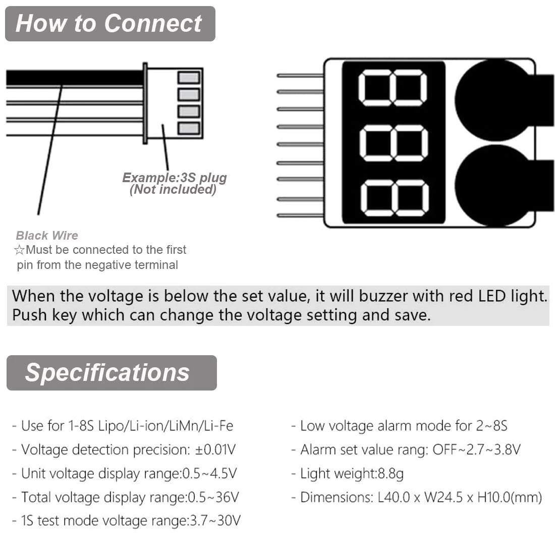 2-8S LiPo Battery Digital Voltage Checker and Alarm
