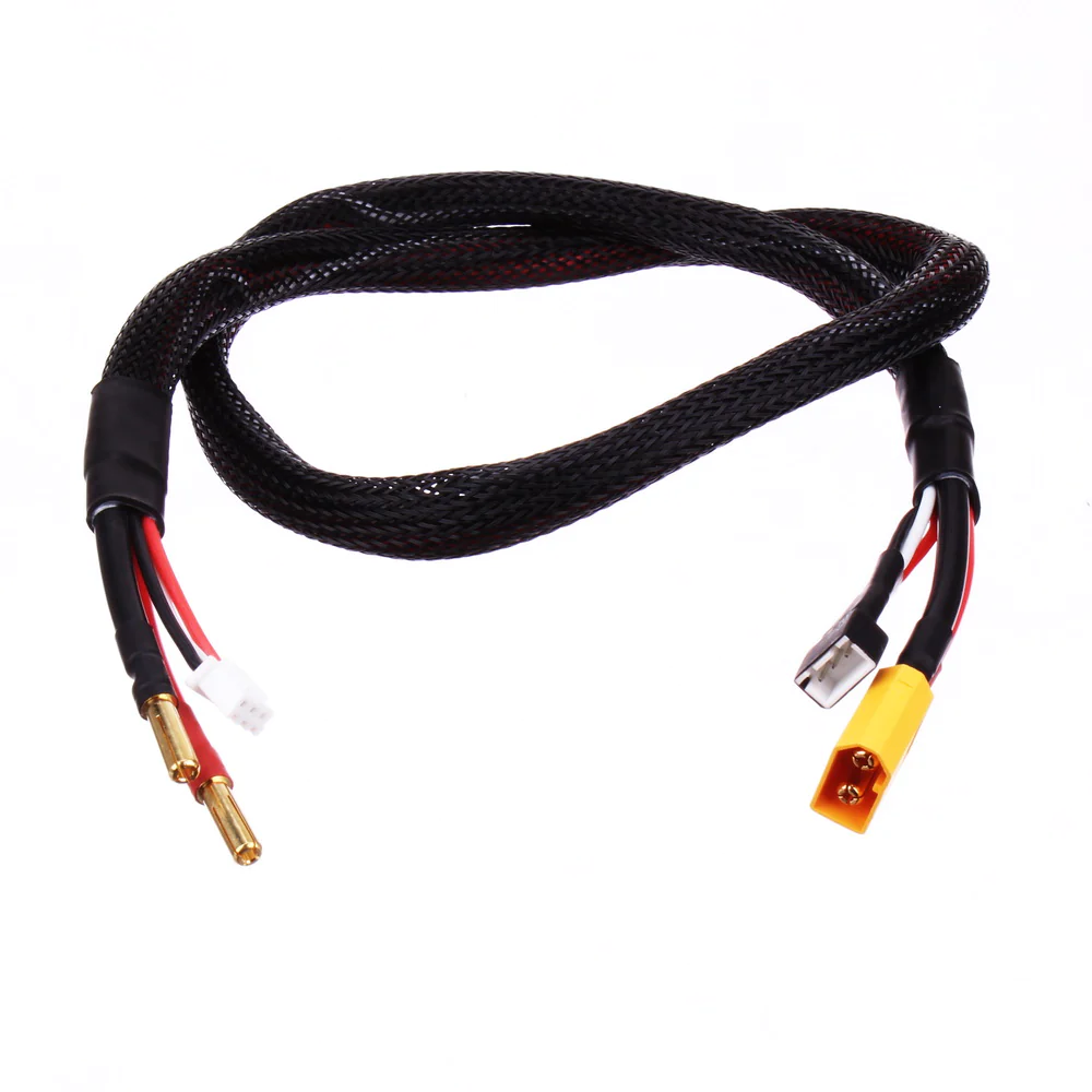 4mm male bullet connector on one end and XT60 on the other with 2s balance extension.