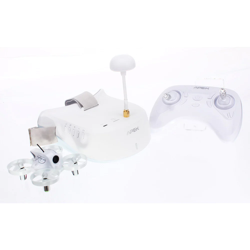 This is a First Person View (FPV) drone set for beginners like to start exploring the world of FPV. The package contains a FPV quad with built-in camera and video transmitter, FPV goggles, a battery and charger. Add a couple of AAA batteries for the radio controller and it is ready to go to enjoy the fun world of FPV.