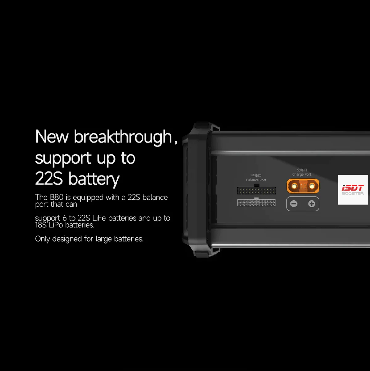 Extensive Adaptability:The B80 is equipped with a 22S balance port that can support 6 to 22S LiFe batteries and up to 18S LiPo batteries.Only designed for large batteries.