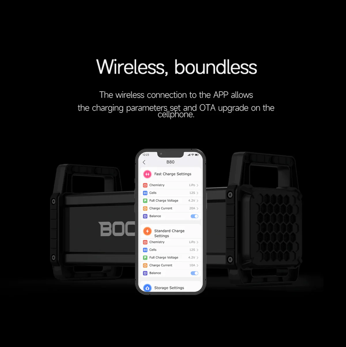 Wireless and Boundless:The wireless connection to the APP allows the charging parameters set and OTA upgrade on the cellphone.