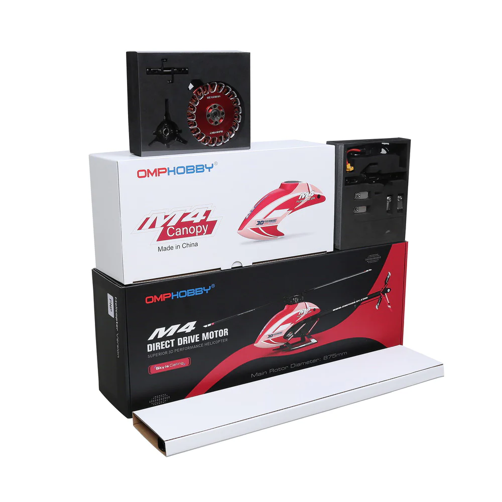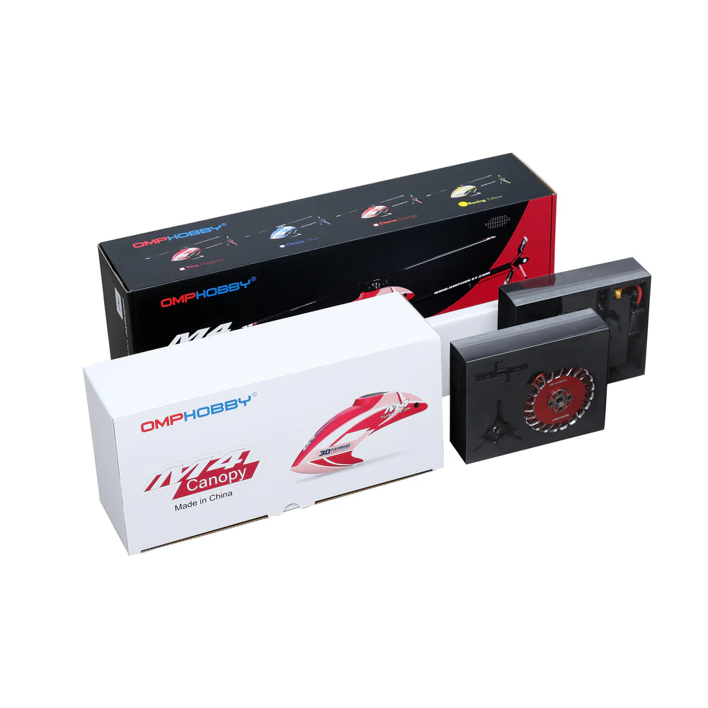 Airframe, main motor, 385mm main blades, 71mm tail blades, 3 OMPHobby metal gear cyclic servos, one OMPHobby metal gear tail servo, and ESC.
