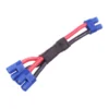 Use this adapter to connect two batteries with EC5 connectors in parallel to get higher capacity, yet the same voltage. For example, if two 6S 22.2V 5000mAh batteries connected in parallel with this adapter, it will be a 6S, 22.2V, 10,000mAh battery pack. Made of 12 gauge soft silicone wires. Net weight: ~45g, 1.6oz.
