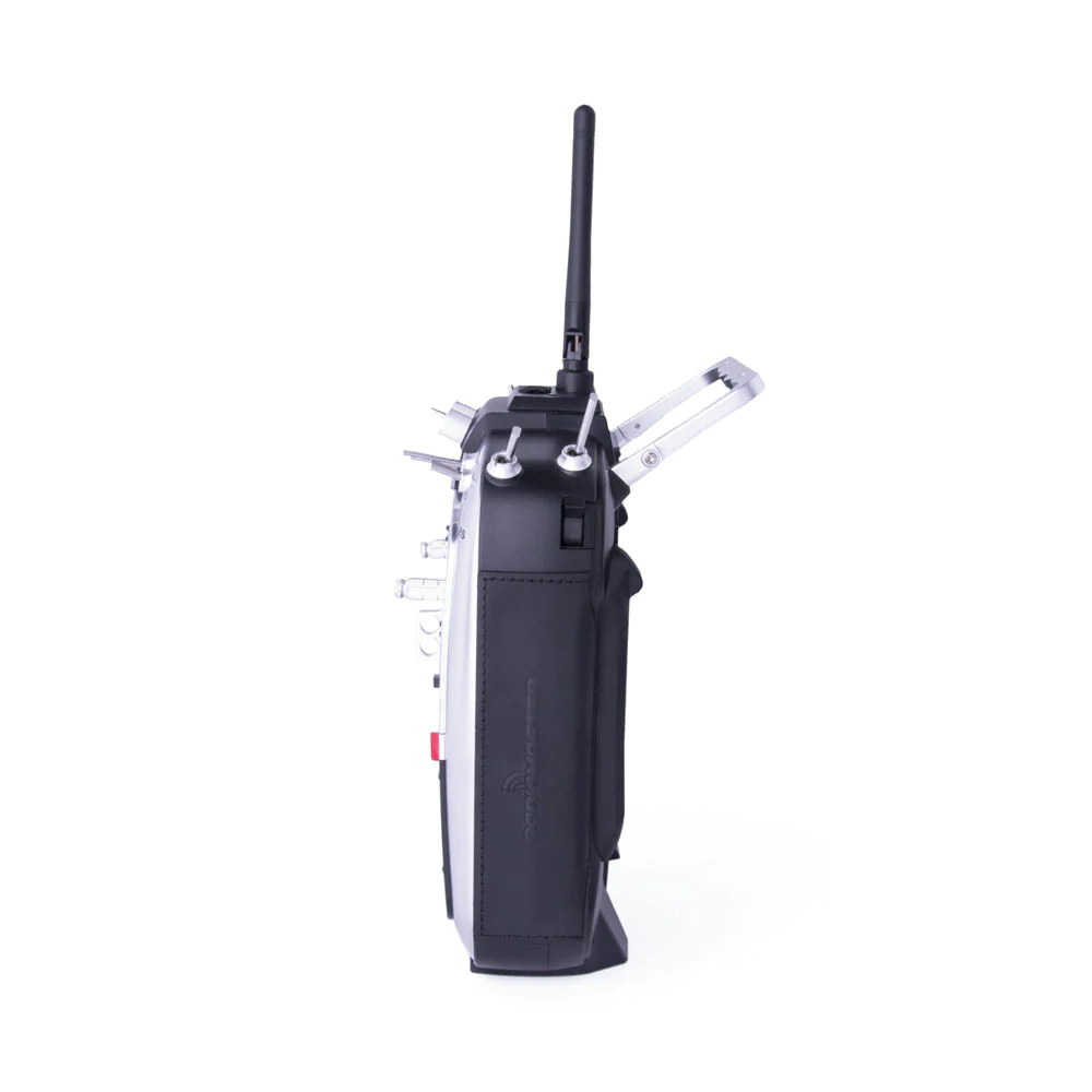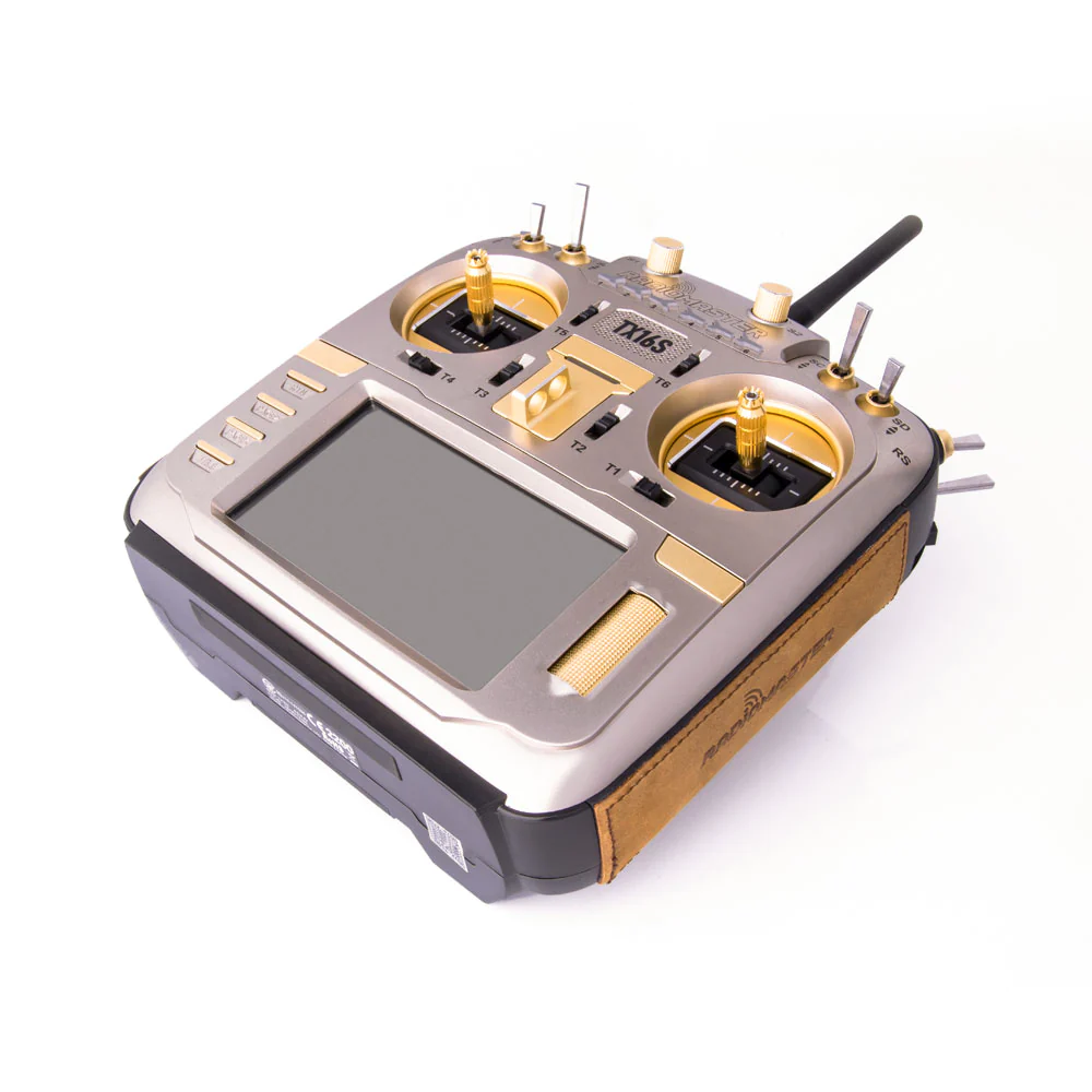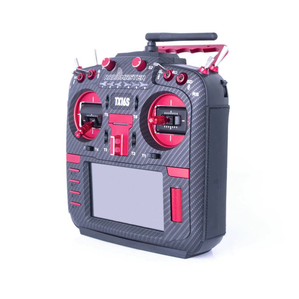 The TX16S MAX is RadioMaster’s flagship radio, featuring CNC option parts and leather grips. The MAX edition is available in three versions: a carbon face plate with red CNC parts and black leather grips, a gold face plate with gold CNC parts and cowboy brown leather grips, and a silver face plate with silver CNC parts and black leather grips.