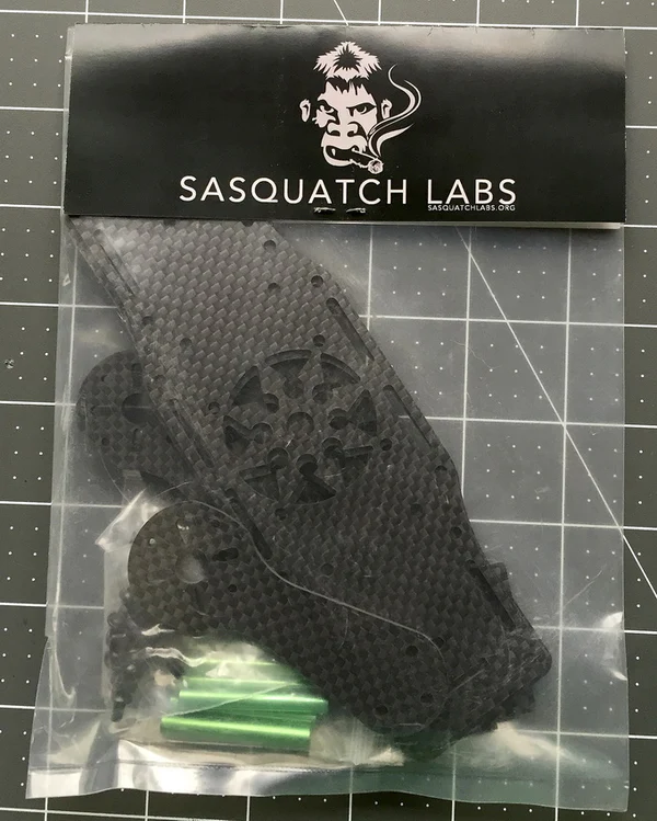 This is the Shuriken V1 frame designed by Labcopilot and Sasquatch Labs. This is an awesome 180 size frame and durable for FPV racing. Frame weight: 85g