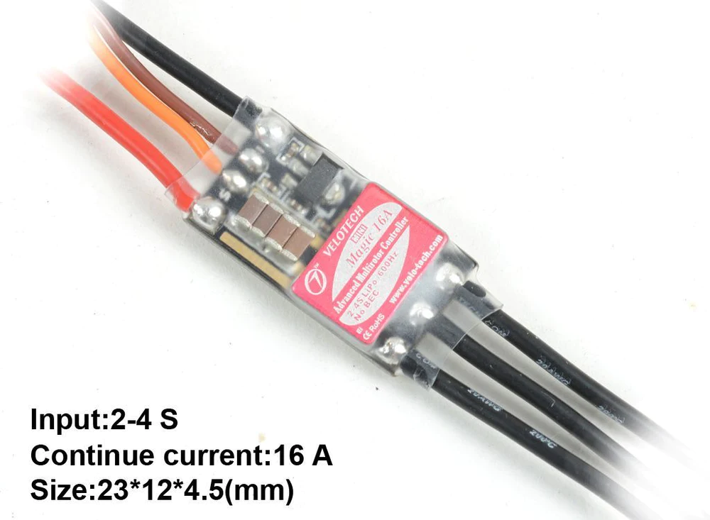 Magic Mini is a series of Velotech miniature ESCs to fit limited space in small multirotors, inheriting the great features and high reliability of the Magic ESCs. Velotech Magic series is one of the best multirotor ESCs we have tested: quick response, smooth throttle, low running temperature, and high reliability. Featured with high efficiency, all N-channel MOSFET design, jitter-free hardware PWM input, and the most popular SimonK program, Velotech Magic speed controllers are an ideal choice for multirotors. Quality electronic parts are used to build Velotech Magic speed controllers, such as genuine Japanese Rubycon capacitor, IOR MOS tubes, heavy duty PCB. These parts cost much more than those cheaper counterparts that are frequently found in low price ESCs. The manufacturing process was strictly controlled and monitored to ensure all electronic parts are properly soldered. Every single ESC was examined in the factory with oscilloscope and other equipments, as well as burn-in test. This product is warranted for six month from the date of purchase to be free from manufacturing and component defects. Limited warranty is handled by Buddy RC at Columbus, Ohio. Specifications: Continuous Current: 16A Voltage Range: 2-4S LiPo BEC Output: N/A Refresh Rate: 600Hz Motor Wires: 18 gauge soft silicone wires Battery Wires: 18 gauge soft silicone wires Dimensions: 23x12x4.5mm Weight:5.6 grams Bootloader: SimonK Firmware: afro